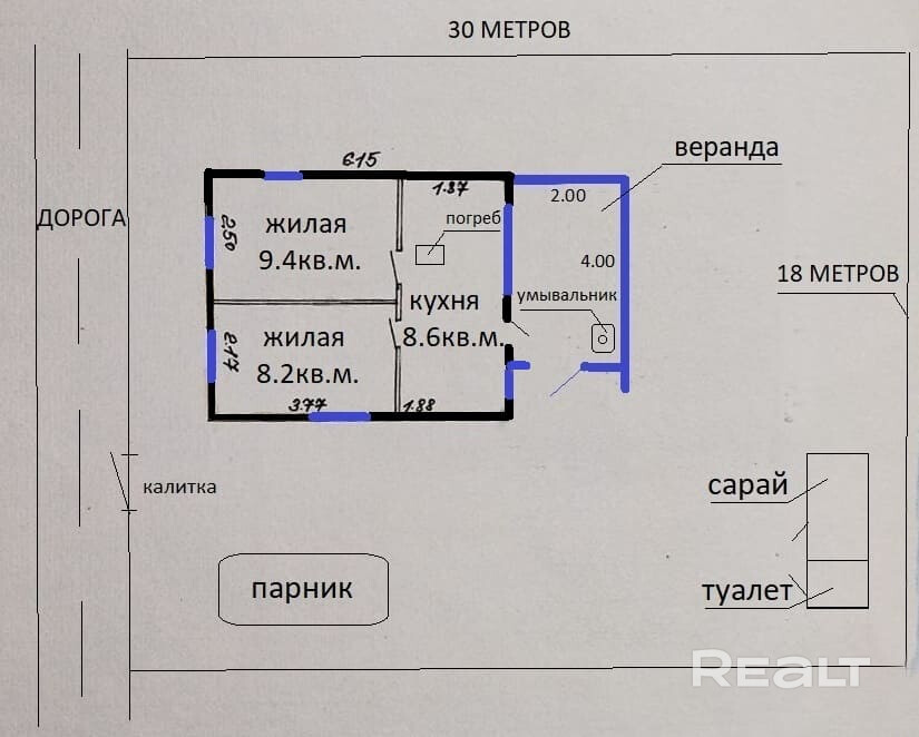 Первый этаж: комната 9.4 и 8.2кв.м, кухня 8.6кв.м, веранда 10кв.м. В кухне находится люк в кирпичный погреб и вход на второй этаж.