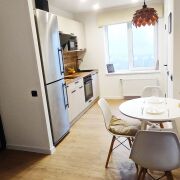 На кухне индукционная панель, духовой шкаф, холодильник, микроволновка.