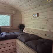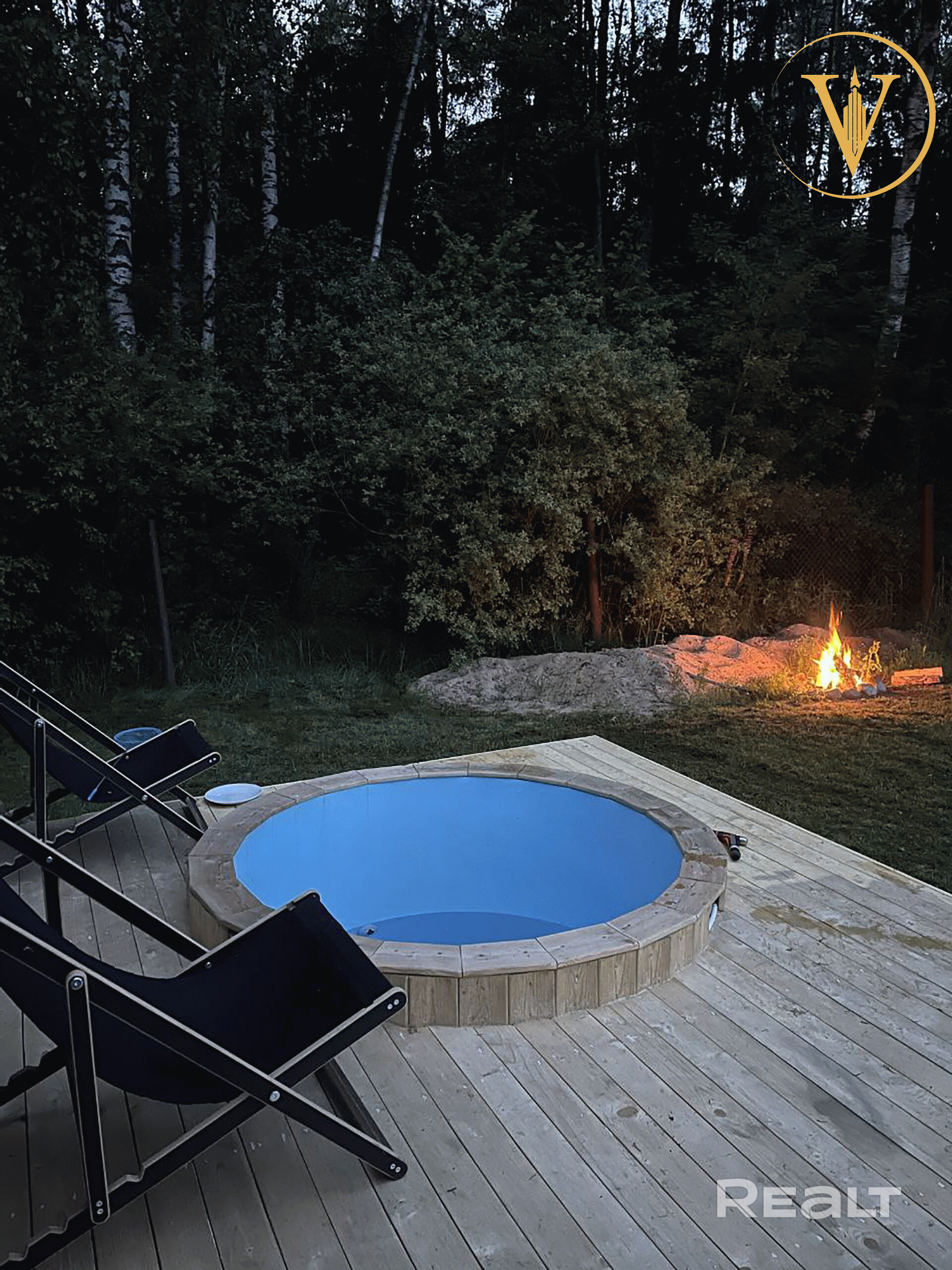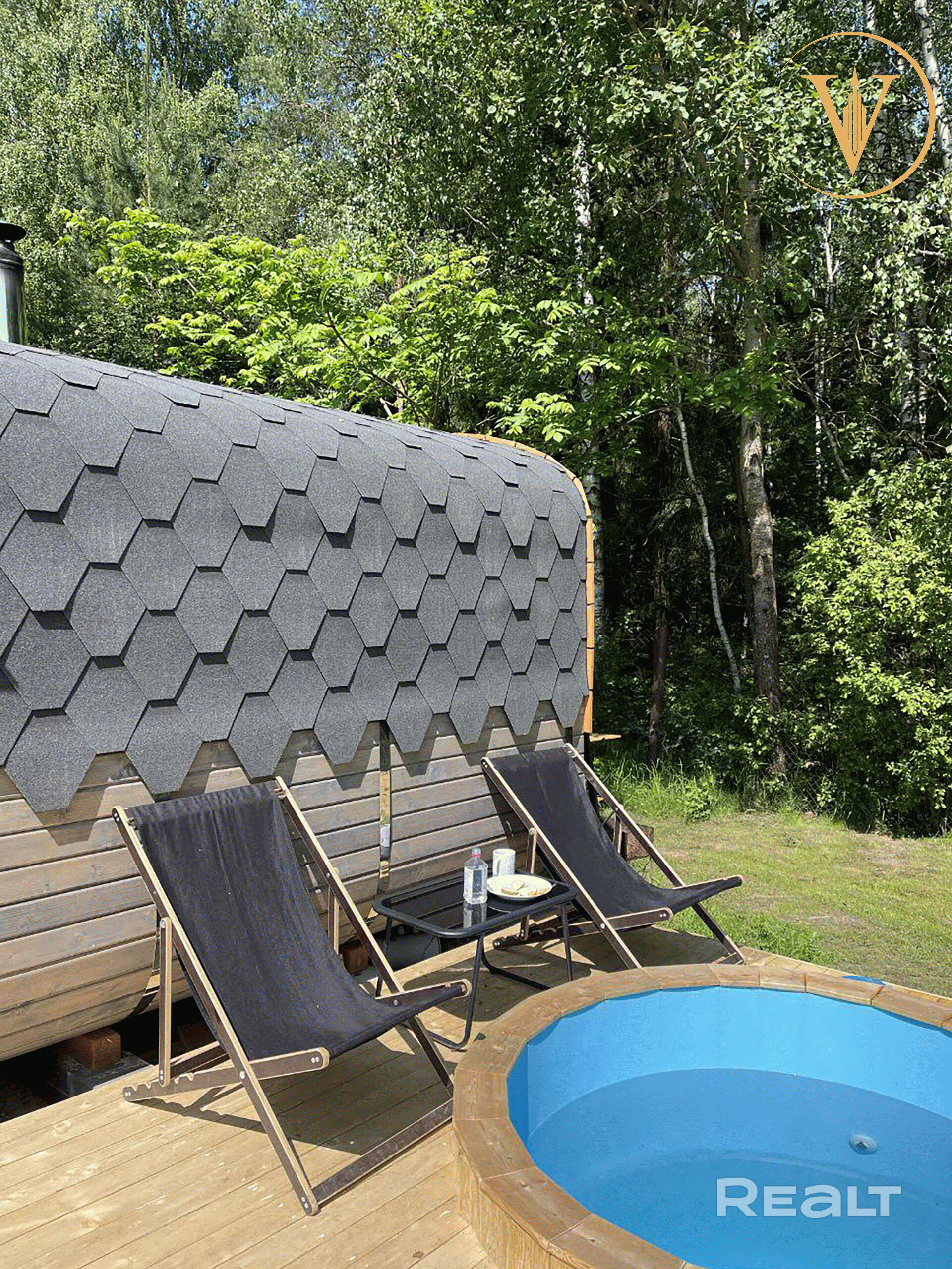 Баня с террасой и купелью расположена у самого леса.