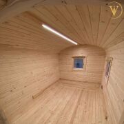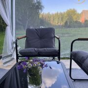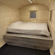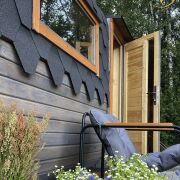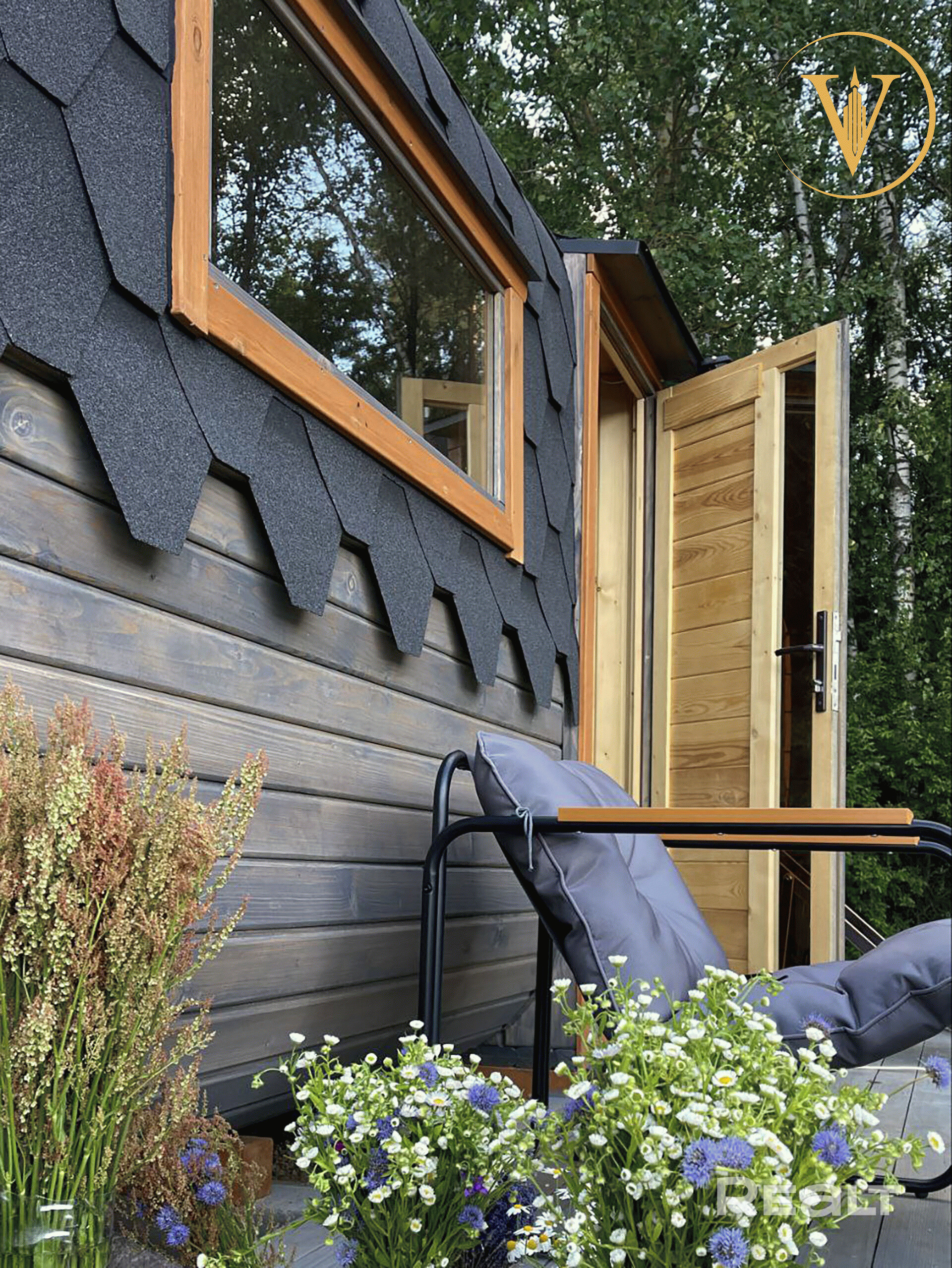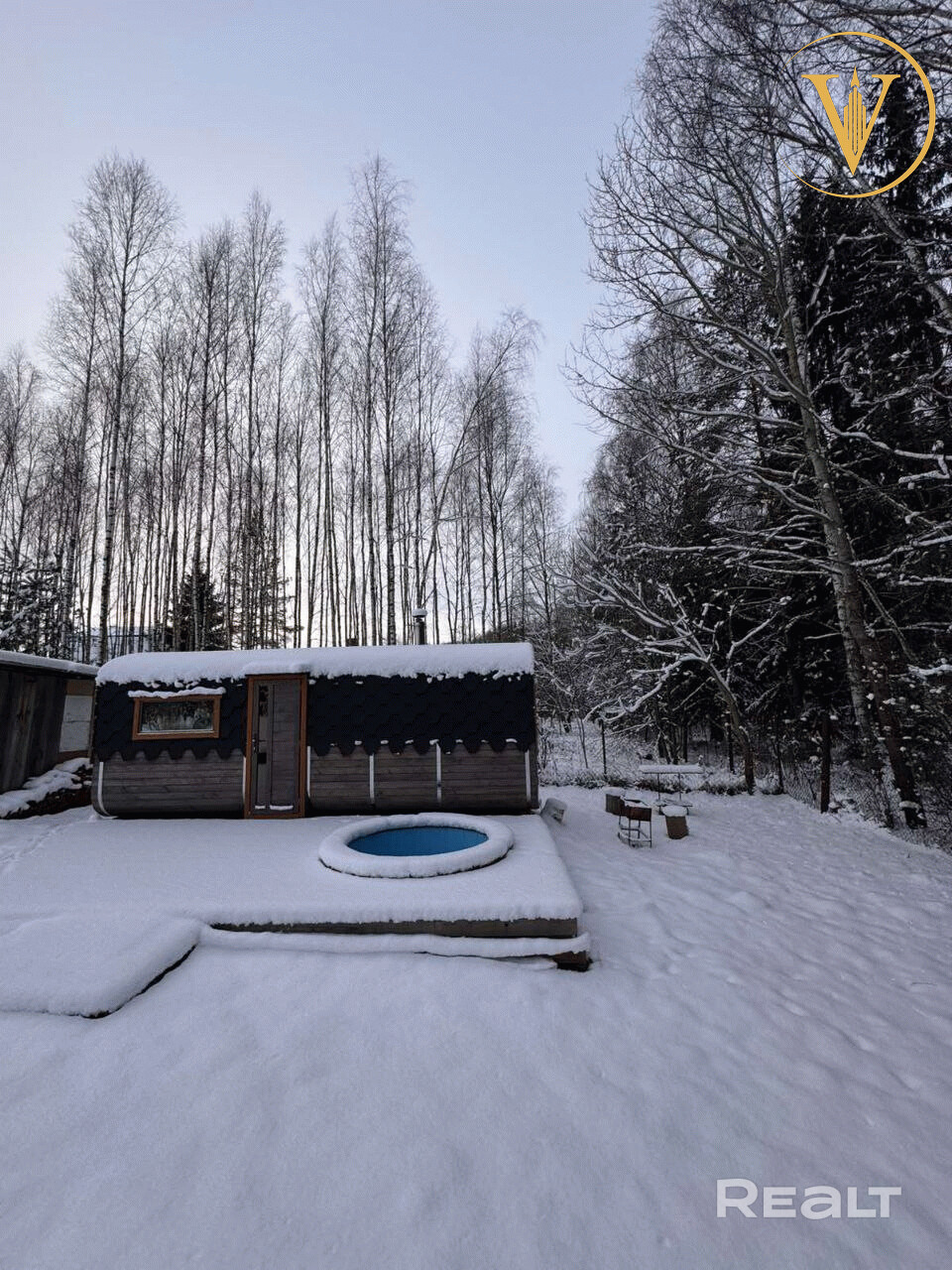 Дом раположен с другой стороны участка и состоит из спальни, кухни и санузла. Из дома открывается потрясающий вид на березовую рощу.