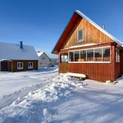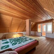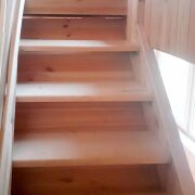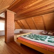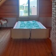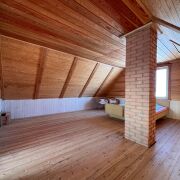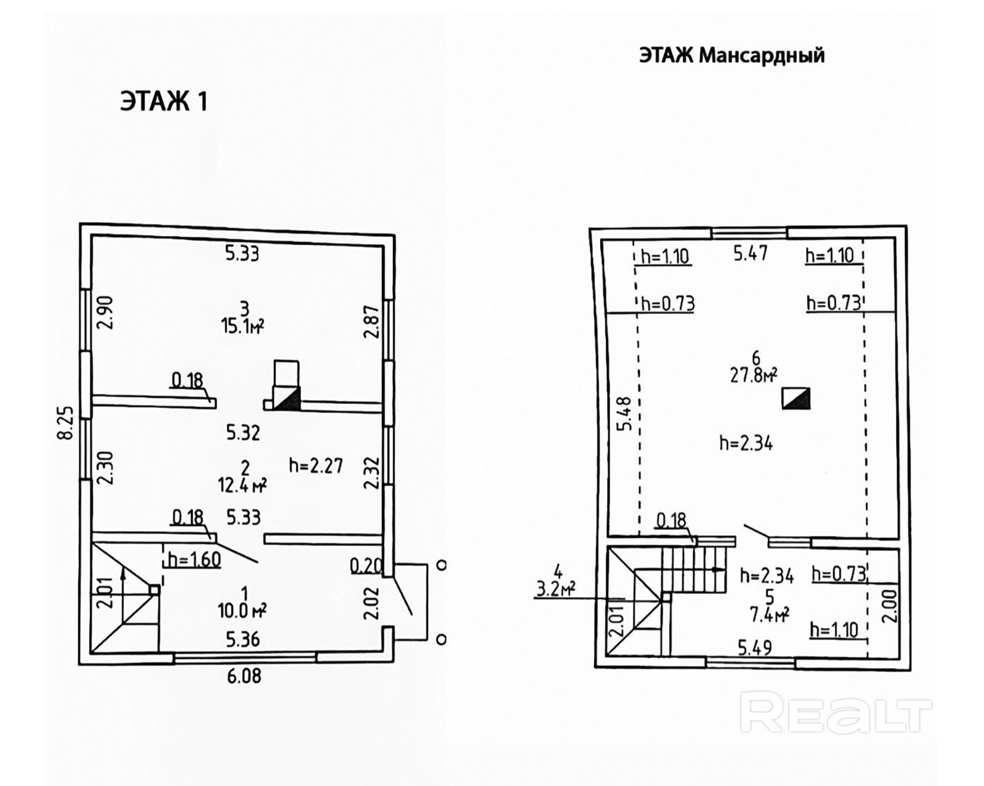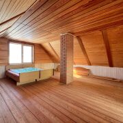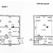 - На первом этаже размещаются: прихожая, просторная кухня-столовая 12,4 кв.м. и жилая комната 15,1 кв.м.; на мансардном этаже: большая жилая комната 27,8 кв.м. На второй этаж ведет удобная лестница.