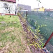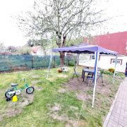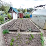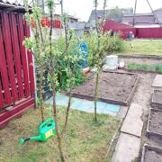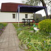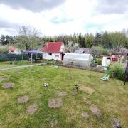Имеется ухоженный газон. Кроме того, имеются насаждения: яблони, слива, кусты смородины, крыжовника и голубики.