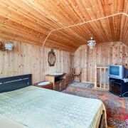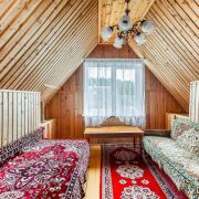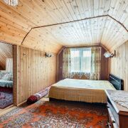 -На втором этаже - две уютные спальни с оригинальной деревянной отделкой и скошенными потолками, что добавляет уюта. Светлые шторы, мягкие ковры, теплое освещение - идеально для спокойного сна после насыщенного дня на природе.
