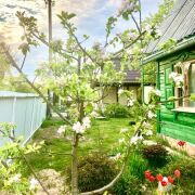 - Садовый дом состоит из двухэтажного бревенчатого здания + пристройка.