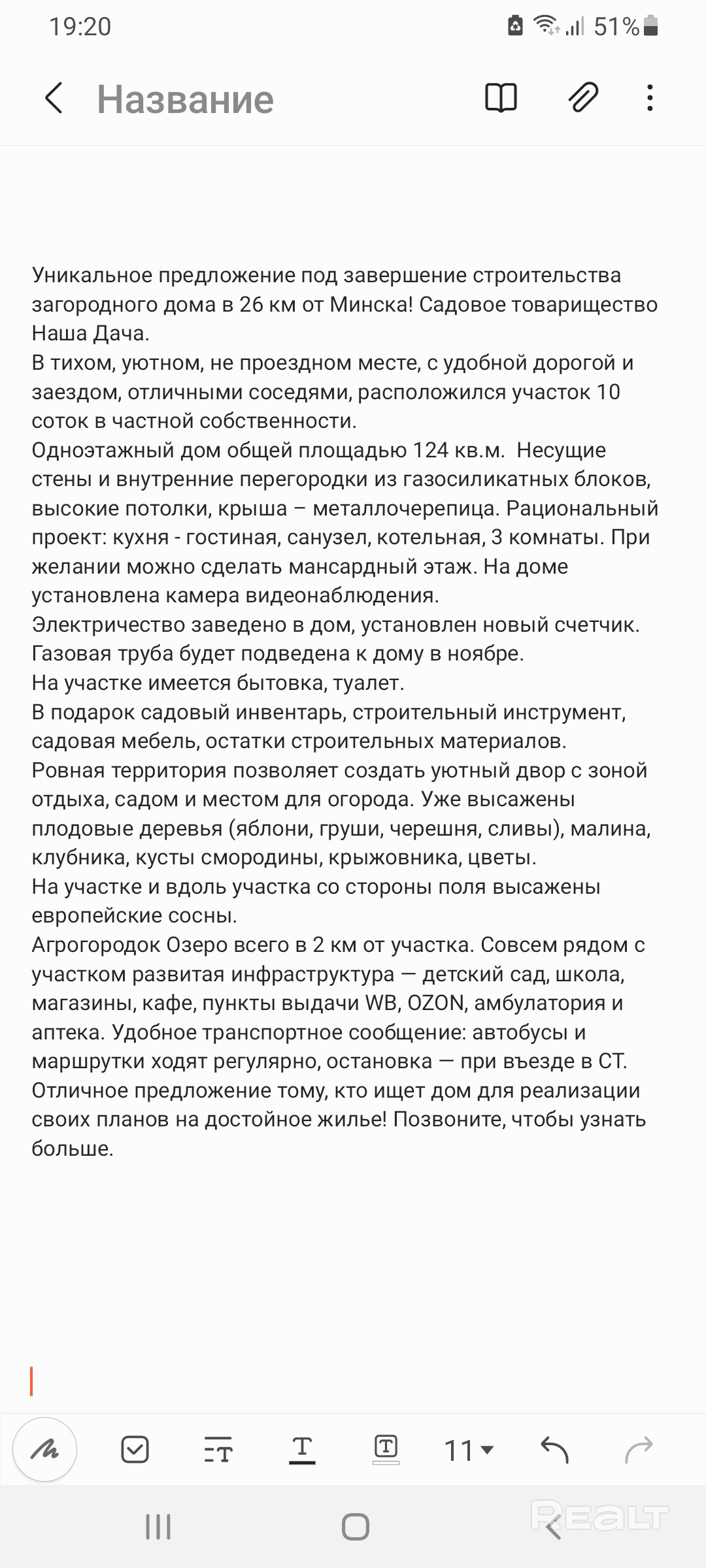 Уникальное предложение под завершение строительства загородного дома в 27 км от Минска! Cадовое товарищество Наша Дача.В тихом, уютном, не проездном месте, с удобной дорогой и заездом, отличными соседями, расположился участок 10 соток в частной собственности. Одноэтажный дом общей площадью 124 кв.м.Рациональный проект: кухня - гостиная, санузел, котельная, 3 комнаты.На доме установлена камера видеонаблюдения.Электричество заведено в дом.