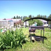 На участке — сад. Вишня, черешня, малина, ежевика, крыжовник, клубника, жимолость. Каждый год — свой урожай. Теплица для рассады, сарай для инструментов, уличная уборная для порядка. Живая изгородь из винограда украшает вход. Ворота для автомобиля — заезжайте.