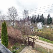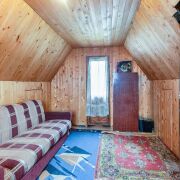 -На втором этаже - комната с деревянной отделкой стен и потолка, удобной планировкой и местом для отдыха или сна. А с балкона открываются живописные виды на лес, который начинается буквально через дорогу.