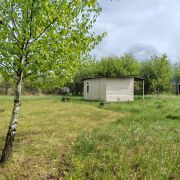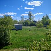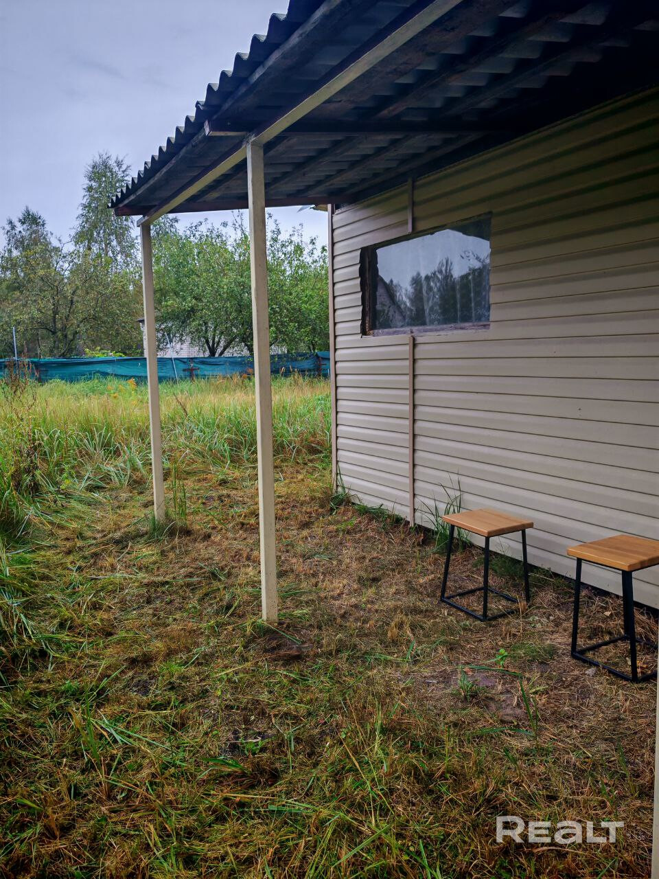 - Новый домик (2022): дерево с утеплением стен и потолка, обшит сайдингом, размер 3×4 м, есть навес на металлическом основании.