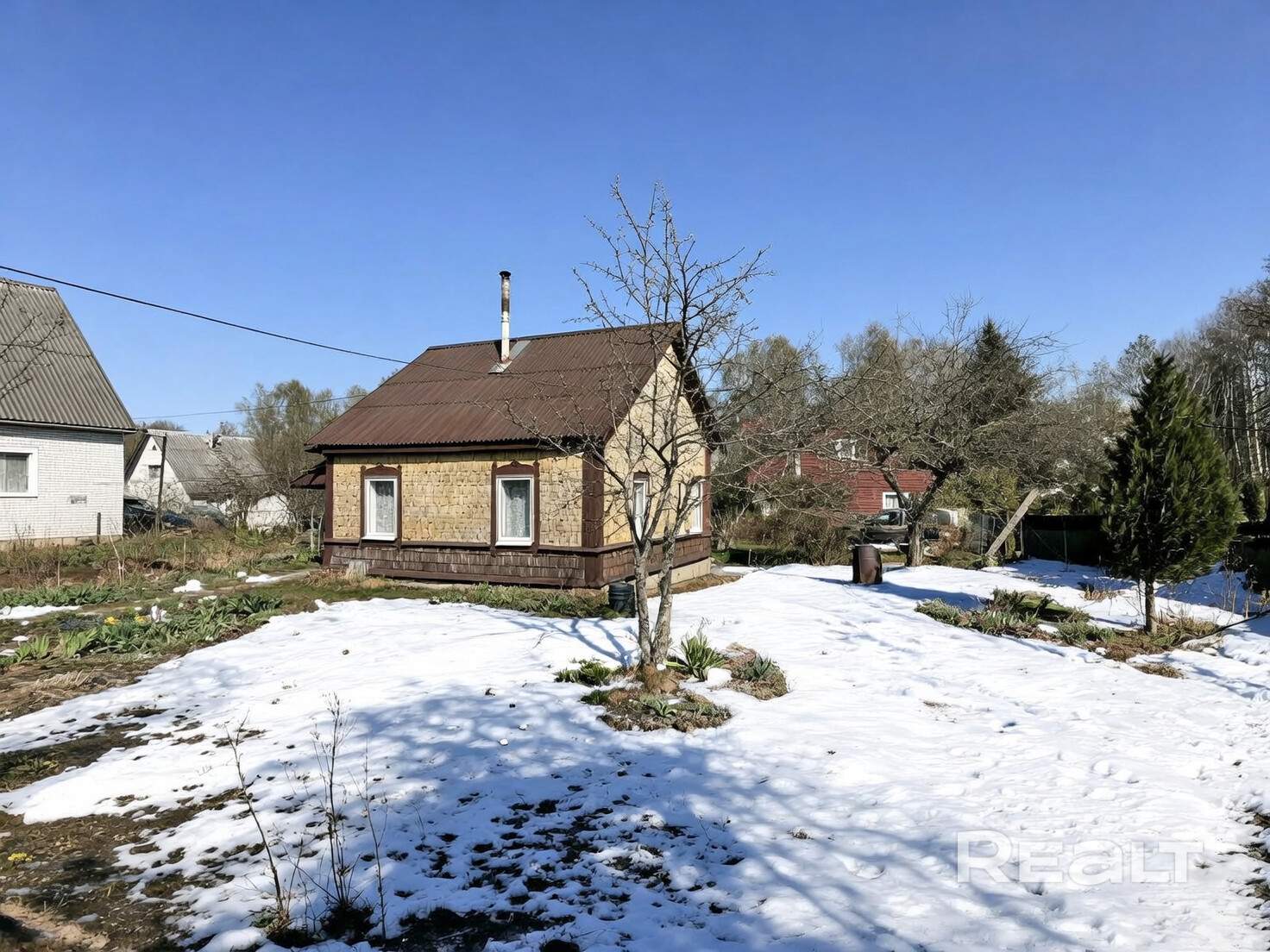 Дом построен из натурального сруба на фундаменте, обложен деревом и обшит осиновой дранкой, что придаёт ему особый загородный характер. Крыша — ондулин. Внутри дом аккуратно отделан вагонкой, благодаря чему создаётся тёплая и уютная атмосфера настоящего дачного дома.