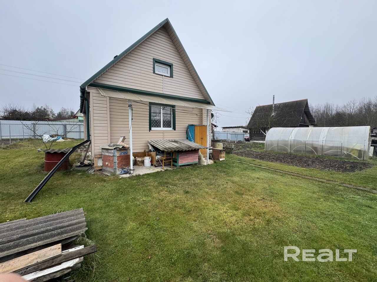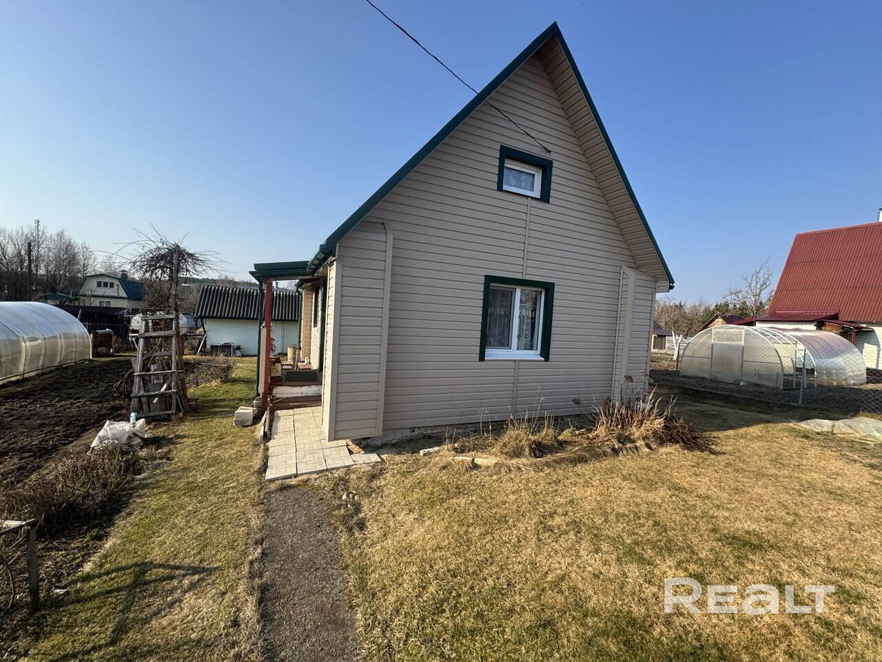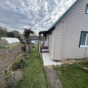 Ухоженная разработанная земля. Есть теплица, укрытая поликарбонатом. Собственная водяная скважина на участке. Материал стен - бревно. Свежая реновация - заменена крыша (металлочерепица), фасады облицованы сайдингом, ПВХ-окна. В домике есть сухой подвал. Печное отопление. Есть баня (с панорамной печью, обшита ольхой), хозблок, туалет с новым унитазом и бачком, летний душ (новый душевой поддон). Электричество (счетчик вынесен на забор), телевизор с DVB-T-антенной, холодильник. По периметру - забор