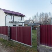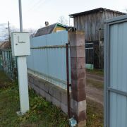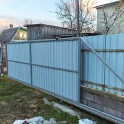 Участок 4,5 сотки. Откатные ворота. Забор с основной улицы – Бетонные столбы + заполнение профнастилом. Забор от соседей – сетка рабица.