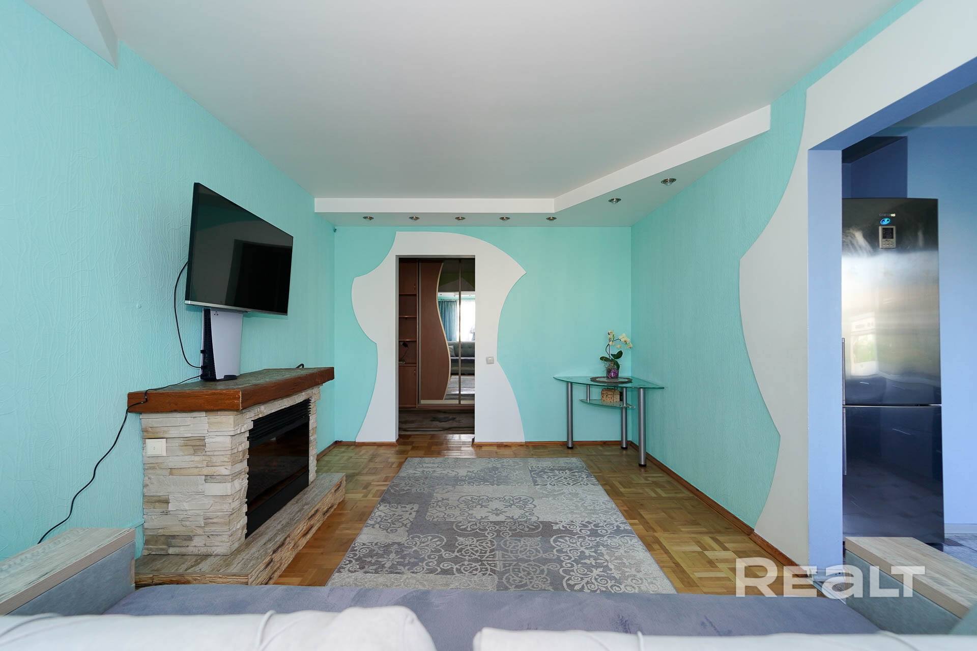 Просторный, большой зал-гостиная с электро камином, встречают Вас на входе в квартиру. Окна- стеклопакеты-деревянные, выходят во двор дома. На полу уложен настоящий паркет.