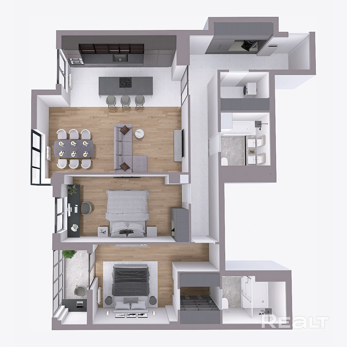 К приобретению доступна квартира 114,7 м2 со свободной планировкой которая располагается в жилом комплексе премиум-класса «Олимпик Парк» (дом 17) на пересечении улиц Тимирязева и Ратомской рядом с водохранилищем Дрозды. Жилой комплекс прилегает к республиканскому заказнику «Лебяжий».