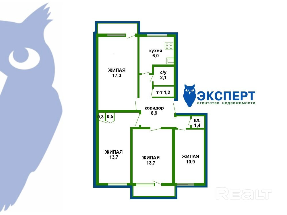 Общая площадь: 75.2 кв. м, жилая: 55.6 кв. м, кухня: 6.0 кв.м. Квартира под ремонт.