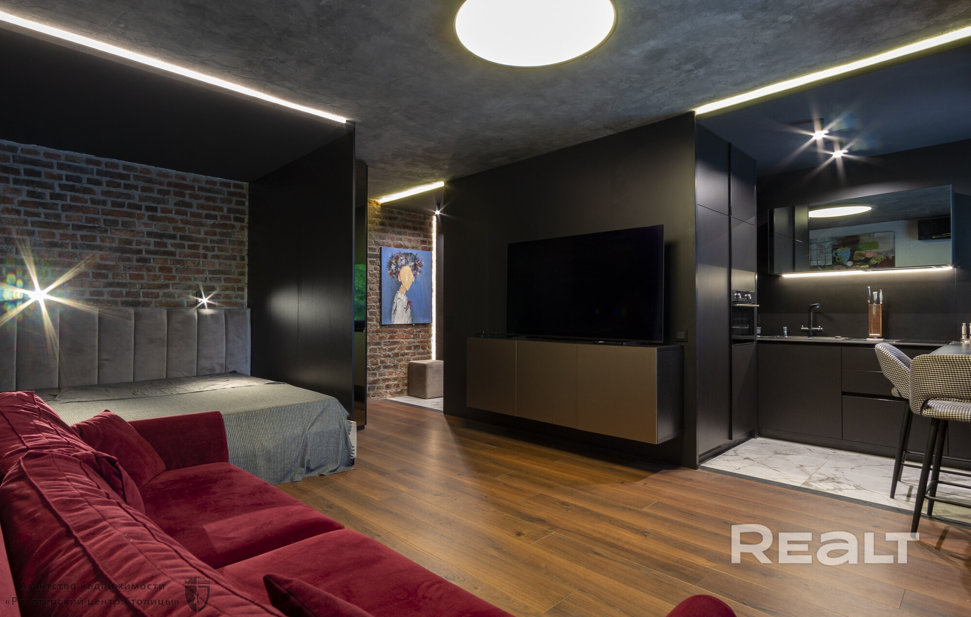 Дизайнерский ремонт квартиры в стиле лофт выполнен из высококачественных материалов.