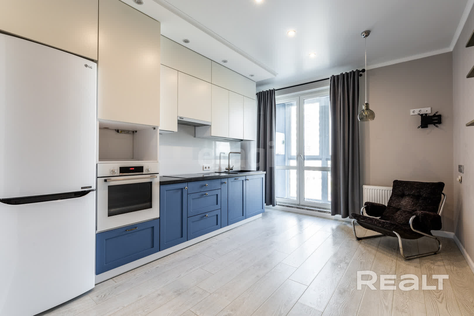 Встроенная кухня, выполненная на заказ – доводчики «Blum», варочная панель «Electrolux», встроенная вытяжка «Backer», духовой шкаф «BOSCH», холодильник «LG». Для вашего комфорта в квартире установлен бойлер «Electrolux», стиральная машина. Площадь указана по СНБ 31,9 м.кв; общая – 29,6 м.кв.