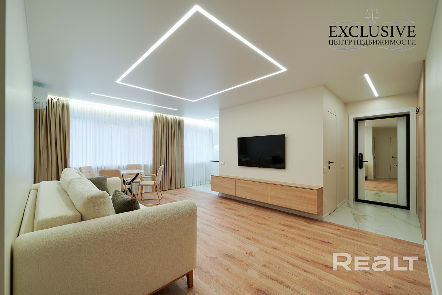 Выполнена высококачественная чистовая отделка с использованием дорогих импортных материалов ( пол сделан с нуля , залита новая бетонная стяжка, стены идеально ровные , потолки натяжные с парящими линиями, карнизы - скрытые, на полах уложен качественный ламинат ( комнаты ), крупноформатный испанский керамогранит уложен без единого шва( коридор , зона кухни, ванная комната ), подоконники выполнены так же из керамогранита, что является интересной деталью интерьера).