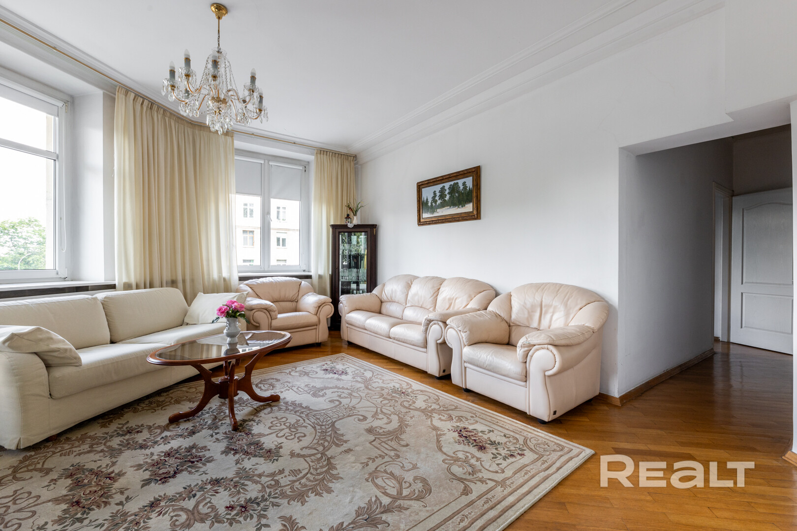 Квартира находится на комфортном втором этаже, из окон открывается чудесный вид на парк Горького и реку Свислочь. Потолки высотой больше 3 метров и площадь 92,5 метра дают ощущение простора и свободного пространства, наполняют квартиру воздухом и естественной прохладой.