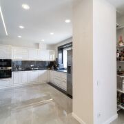 Встроенная кухня, изготовленная по индивидуальному проекту с фасадами крашенный глянец с выборкой. Фурнитура - премиальная линейка Blum. Столешница - бразильский натуральный гранит. Вся техника премиум линейки Bosh (духовой шкаф, свч, посудомойка, варочная панель, холодильник,вытяжка), чистовая сантехника - Blanco, фильтра, измельчитель.