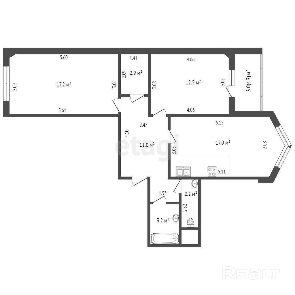 Одно из главных преимуществ этой квартиры - большая кухня площадью 17.0 квадратных метров. Здесь вы с легкостью сможете создать идеальное место для готовки и приема пищи.