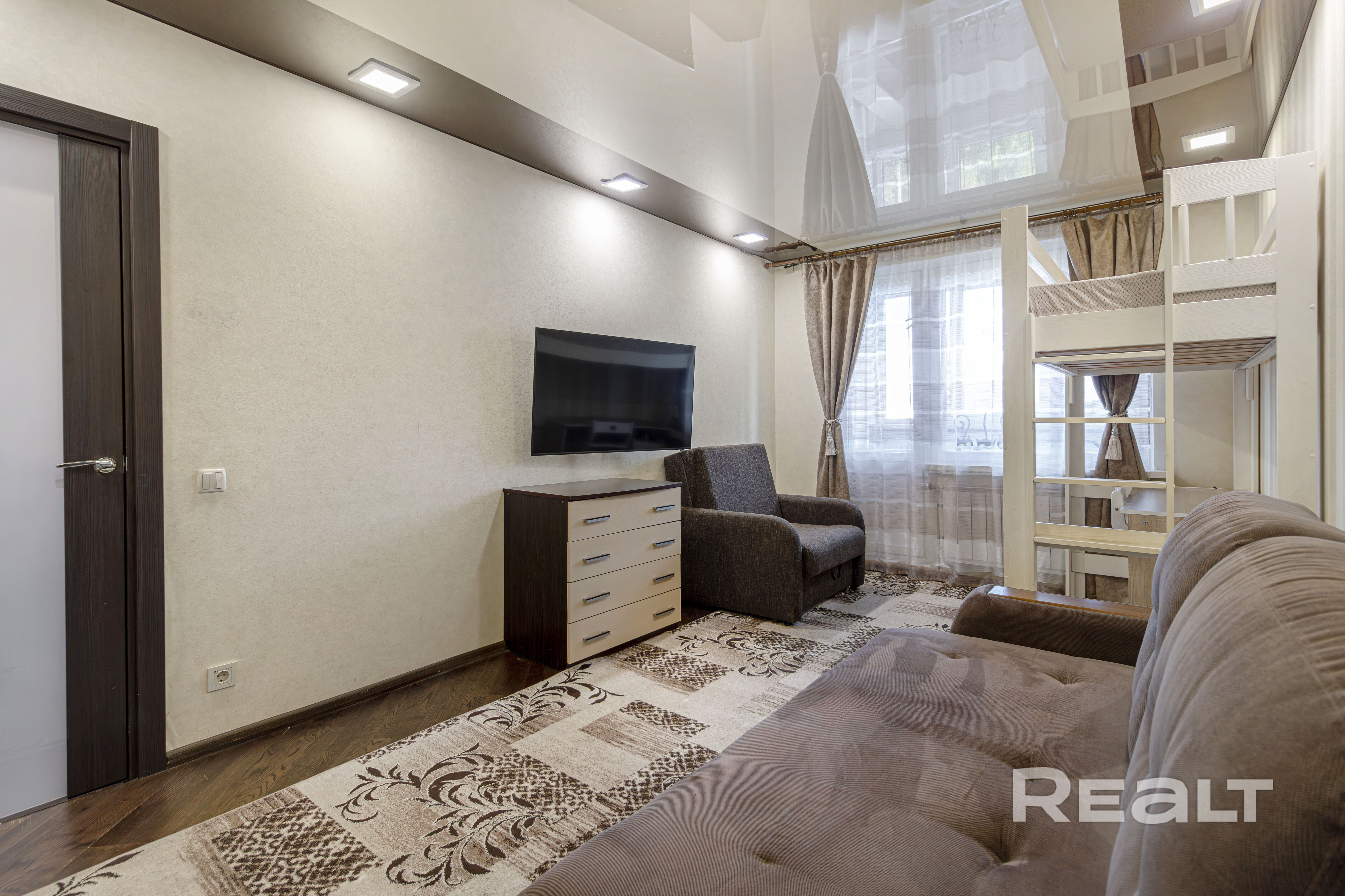 В жилой комнате на полу - паркетная доска, установлены межкомнатные двери, потолки - натяжные с зонированным освещением.