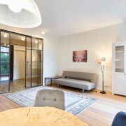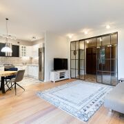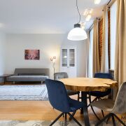 Интерьер — новый дизайнерский ремонт в скандинавском стиле с элементами лофта. Натуральное дерево, камень и металл подчеркивают качество и долговечность отделки. Кухня из массива ясеня, полы и окна из лиственницы, мраморные подоконники, сантехника Keramag, дизайнерский свет из Германии, техника – Bosch. Центральный акцент — стол ручной работы из слэба капового тополя. Очищенная кирпичная кладка, металлическая перегородка и открытые балки придают пространству характер и уникальность.
