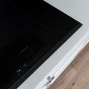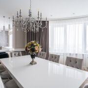 В интерьере использовали только импортные материалы (на полу итальянский керамогранит Italon и бельгийский ламинат Balterio, французская сантехника Jacob, бытовая техника (СВЧ-печь, духовой шкаф, варочная панель) Bosch, посудомоечная машина AEG, встроенный холодильник Liebherr, вся мебель изготовлена на заказ (текстильные материалы – Италия)