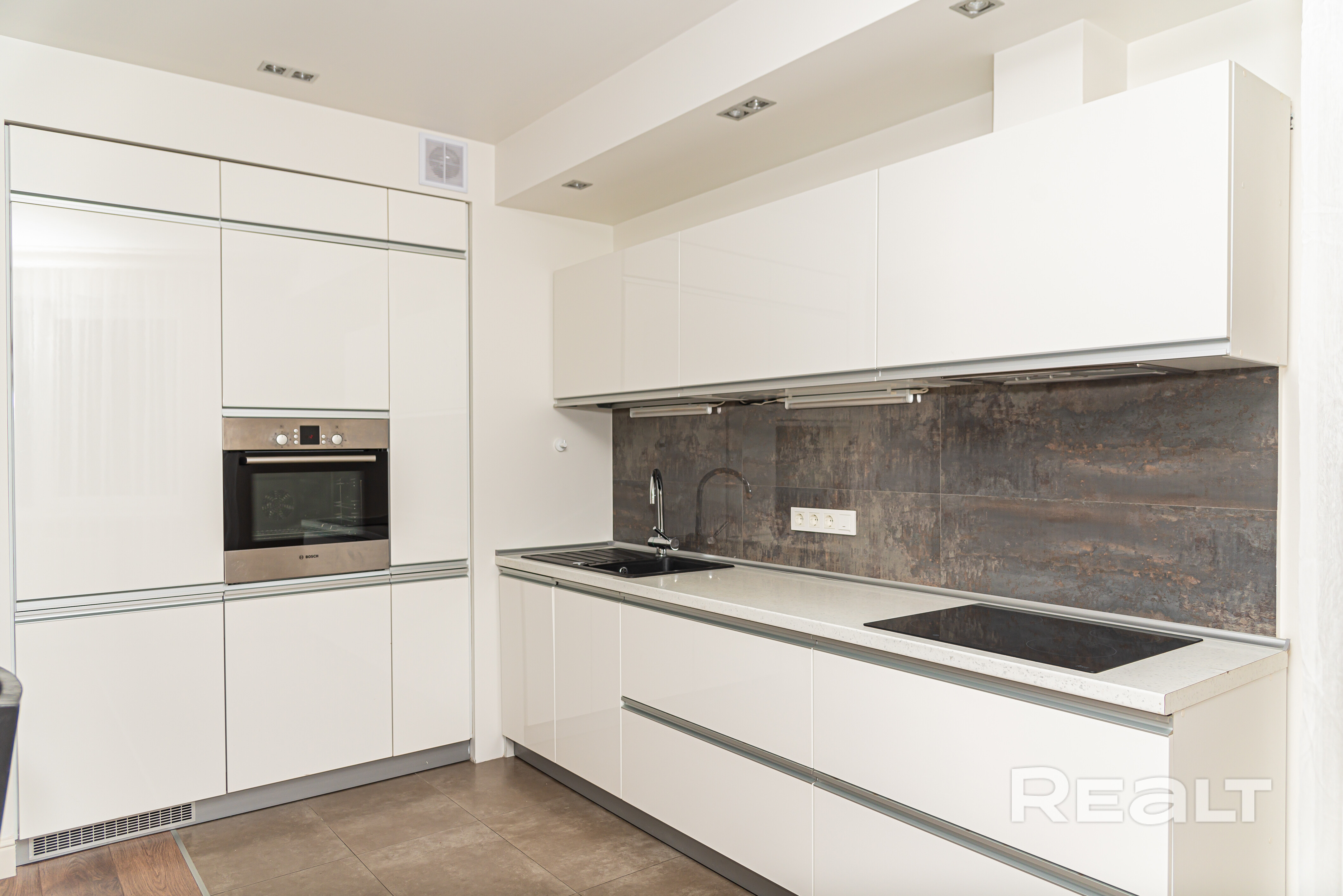• Кухня 11,7 м2 объединена с жилой комнатой: фасады крашенный МДФ, система доводчиков BLUM; индукционная варочная панель и духовой шкаф Bosch; вытяжка Faber; встроенные посудомойка Electrolux, холодильник Siemens, стиральная машина с сушкой Hotpoint Ariston. На кухне также расположена обеденная зона (стол и стулья).