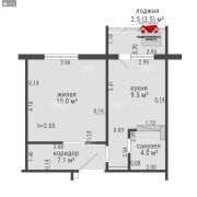 Общая площадь квартиры составляет 35.6 кв.м., жилая 15 кв.м., кухня 9.5 кв.м.