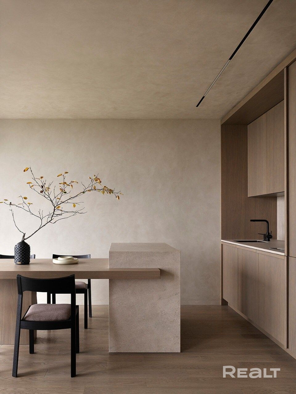Мебель изготовлена по индивидуальному проекту компанией Domani из шпона дуба+ керамогранит Inalco (премиум Испания). Стулья из массива дуба покрытые тонированным маслом. Двери высотой 2500 изготовлены компанией Lazio.