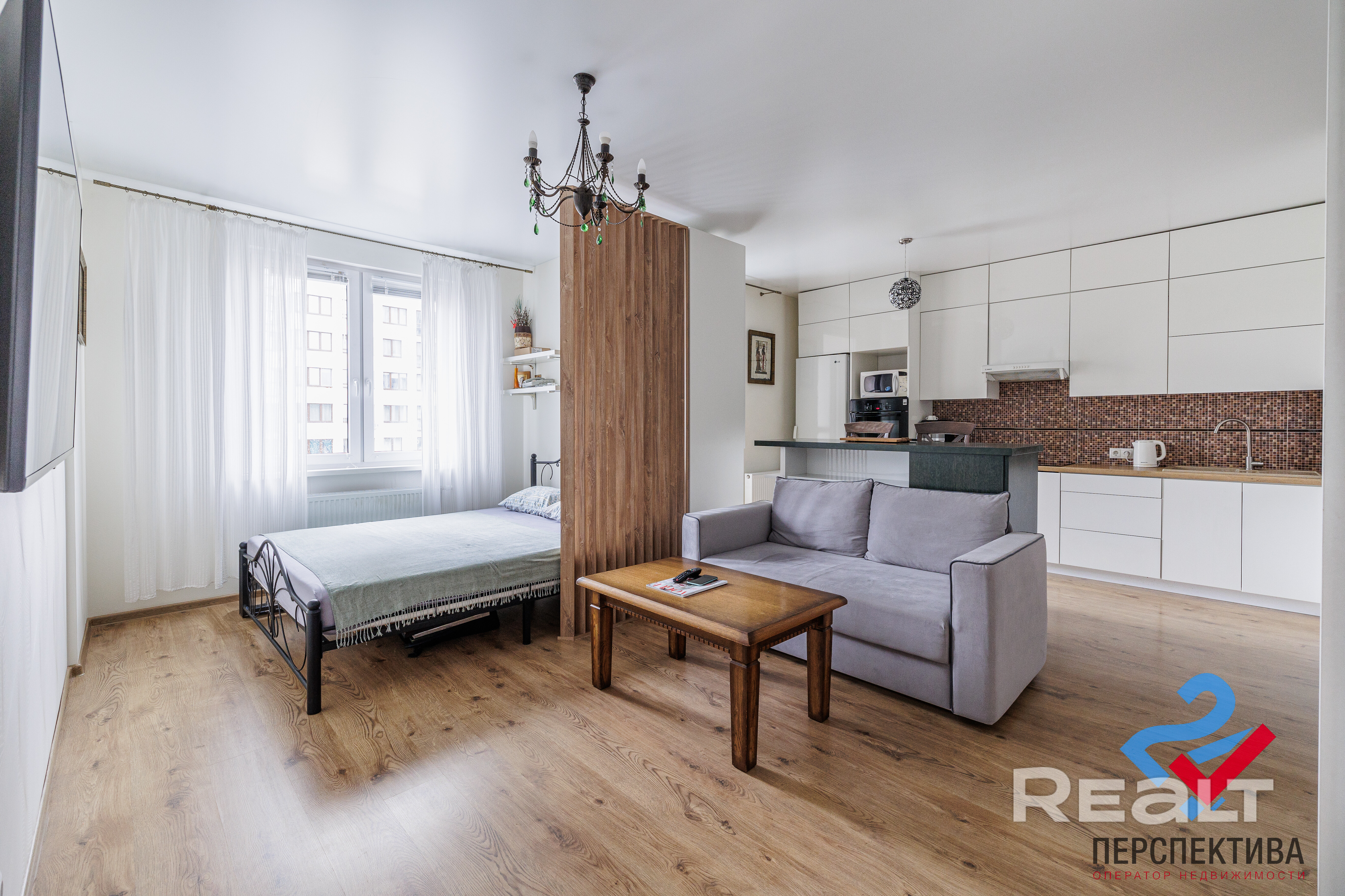 Продается светлая студия в ЖК "Маяк Минска", дом "Руссо"! Квартира расположена на 6 этаже 16 этажного каркасно-блочного дома. Квартира состоит из кухни совмещенной с гостиной площадью 33.5 м2, совмещенного санузла 4.2 м2 и лоджии 2.9 м2. Общая площадь квартиры 40.6 м2. Напольное покрытие в жилой зоне - ламинат 33 класса, в коридоре и санузле - плитка Квартира готова для проживания. Окна в квартире выходят во внутренний двор.