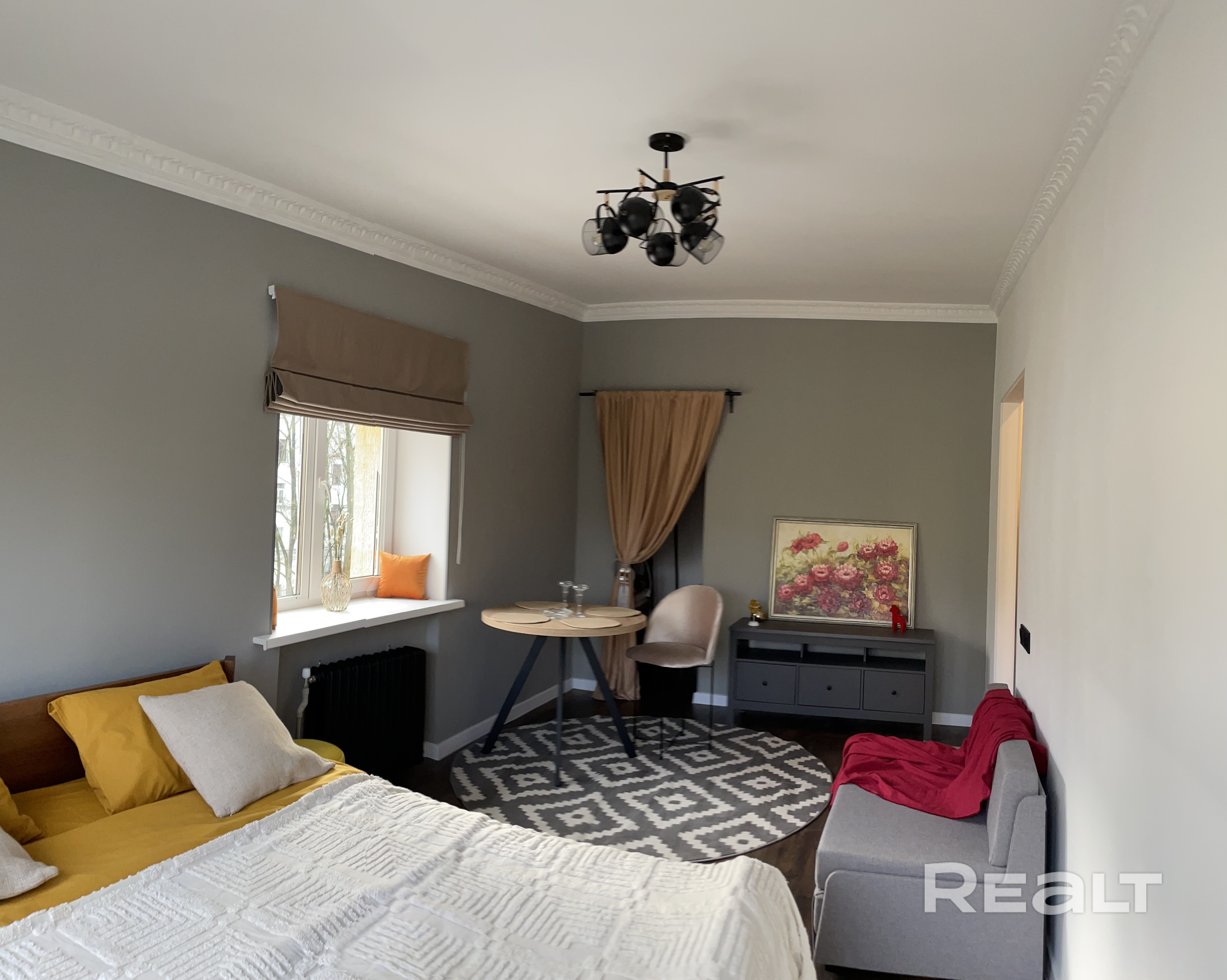 стены окрашены, потолок выровнен, оригинальная лепка