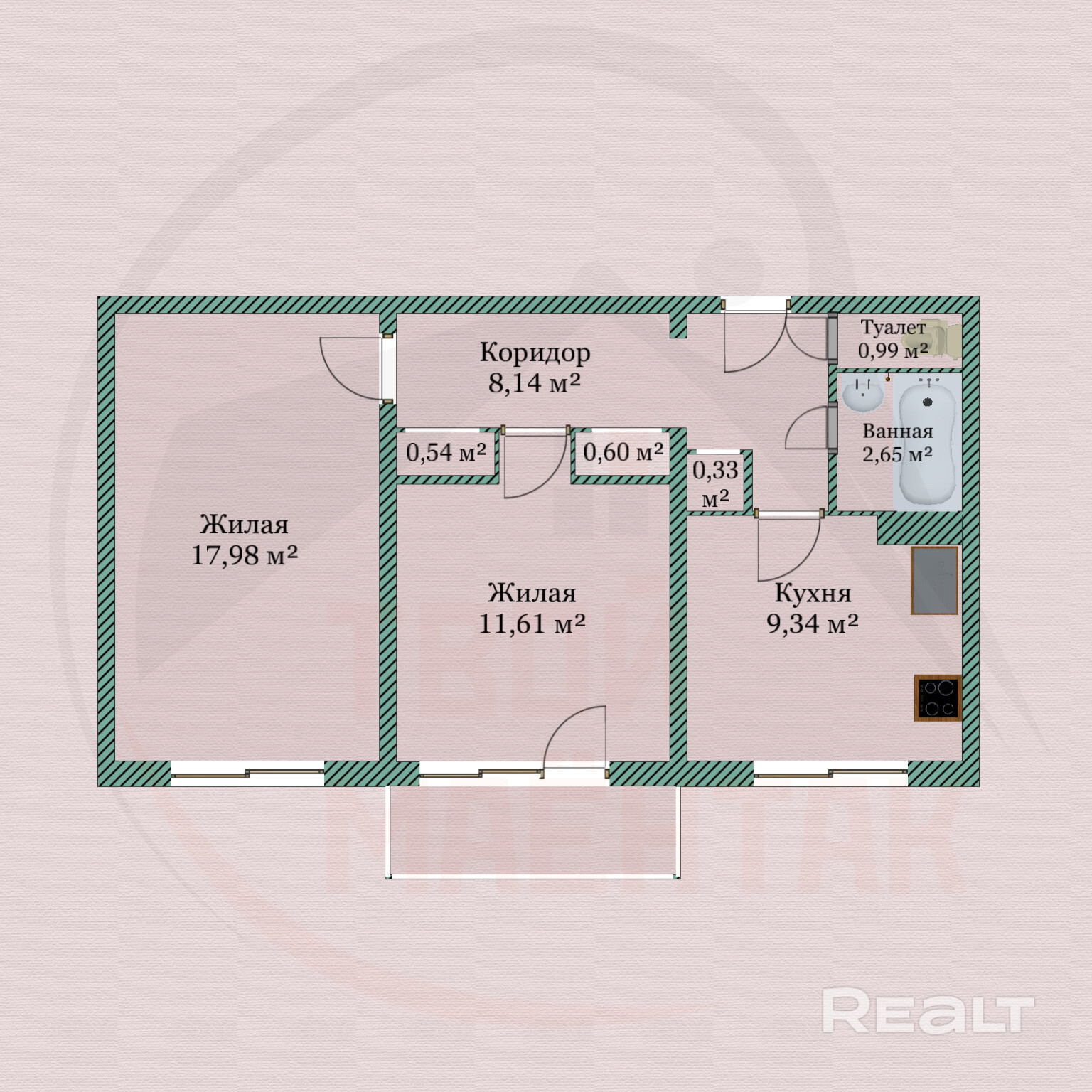 - Комфортная кухня площадью 9.34 м.кв позволит готовить с удовольствием и устраивать приятные посиделки с родными и близкими за общим столом.