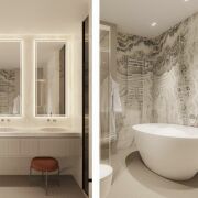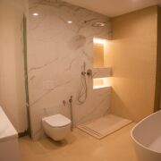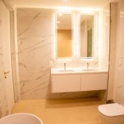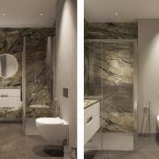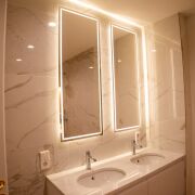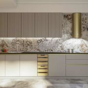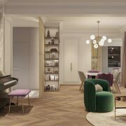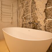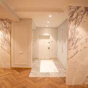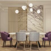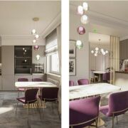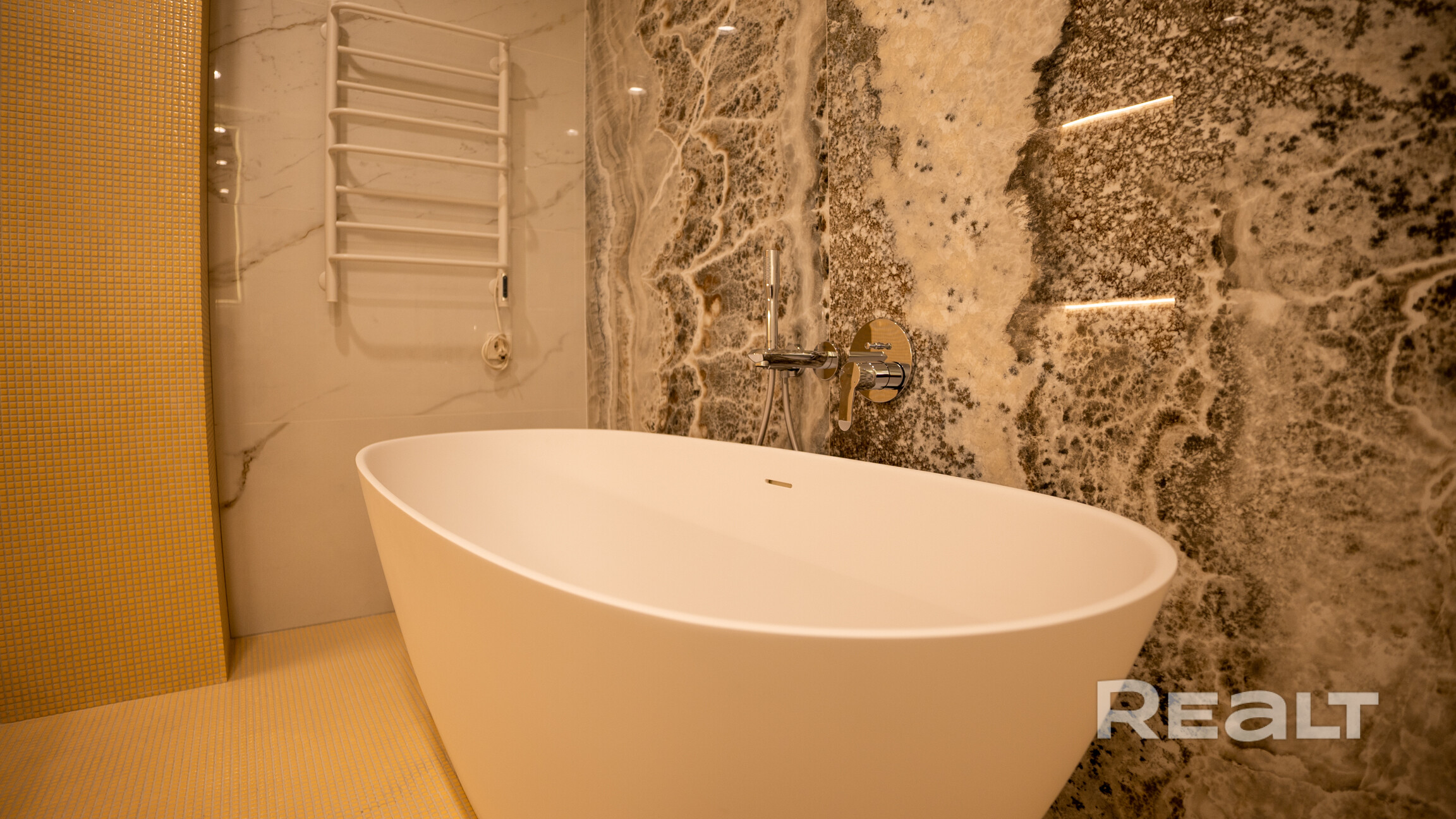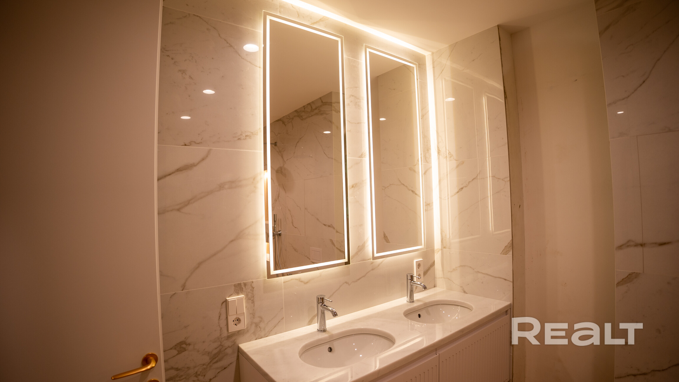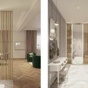 Используются латунь, эксклюзивная древесина (американский орех) и отборный натуральный камень. Исполнение во всех помещениях разное, но выдержано в едином стиле, создающем гармоничное и эстетичное пространство.