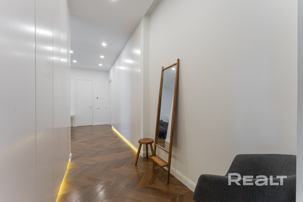 В прихожей за скрытыми, высокими дверями расположено огромное пространство для гардероба.