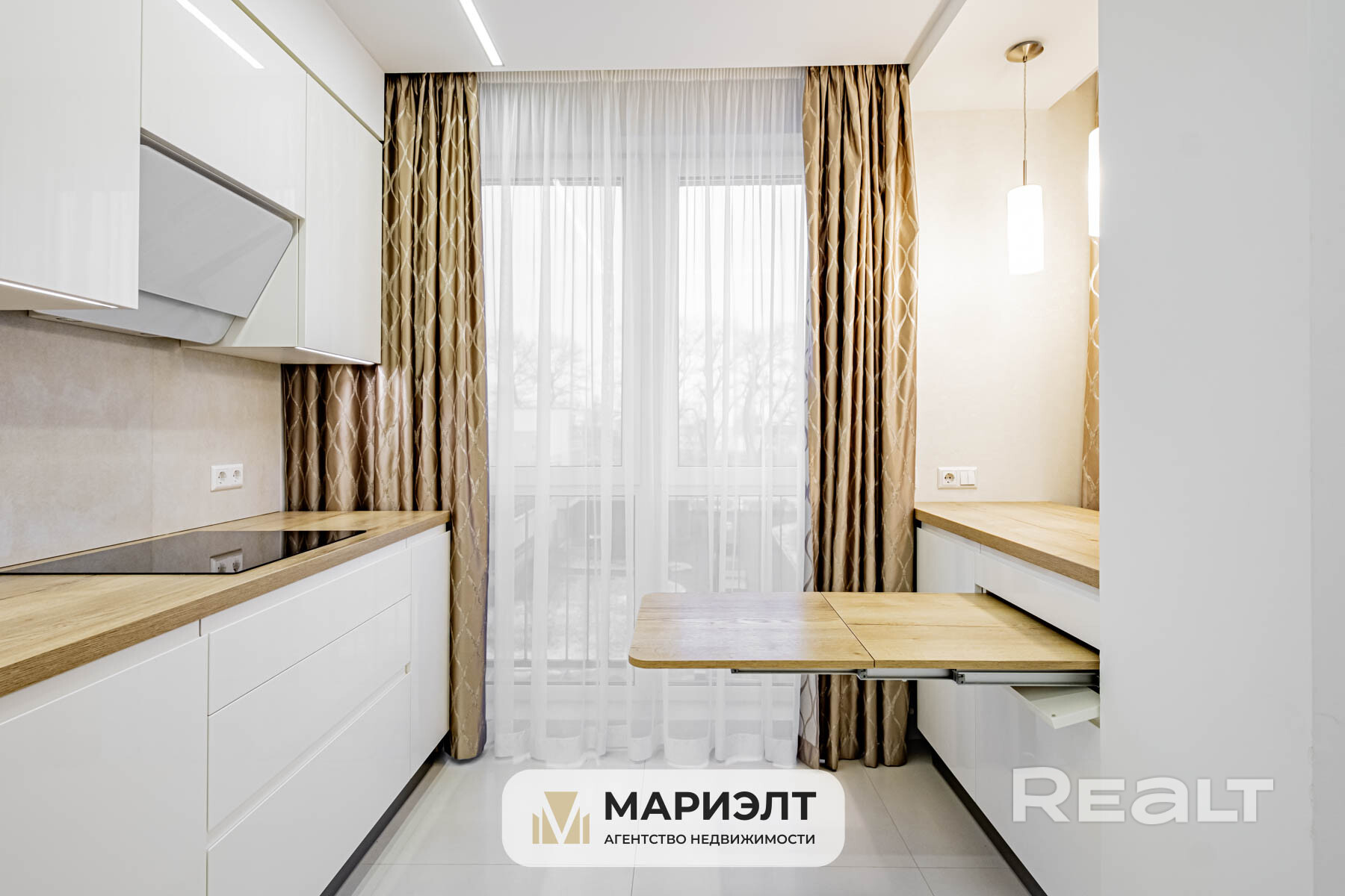 Неоспоримым преимуществом этой квартиры, является то, что утверждена перепланировка, доля жилой площади достигает 70% от общей площади квартиры, благодаря дизайн проекту известного минского дизайнера, технический дизайн квартиры продуман до мельчайших деталей, личная зона спален отделена сдвижной дверью , в открытом виде, которая прячется в стену, и благодаря которой исключена какая либо слышимость извне. Продуманное зональное освещение и мягкий свет всего интерьера создает максимальный комфорт добавляет ощущение чистоты.