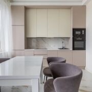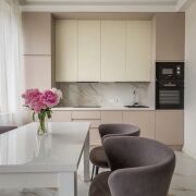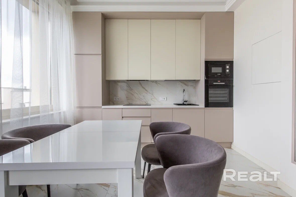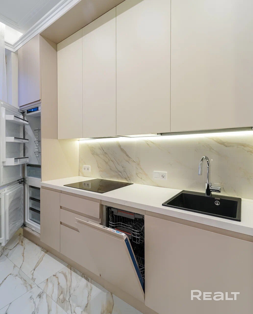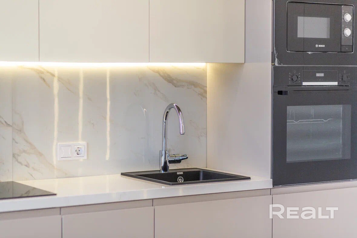 Кухня-гостиная: площадью 27 м2. Пространство визуально разделено на зону кухни и гостиной, большое количество света. Во всю стену установлен шкаф-витрина с подсветкой, каменная столешница, установлена вся необходимая мебель и техника. Микроволновая печь, духовой шкаф, индукционная панель и посудомоечная машина марки Bosh, вытяжка Elica, холодильник Liebherr. Вся техника привезена из Европы.