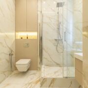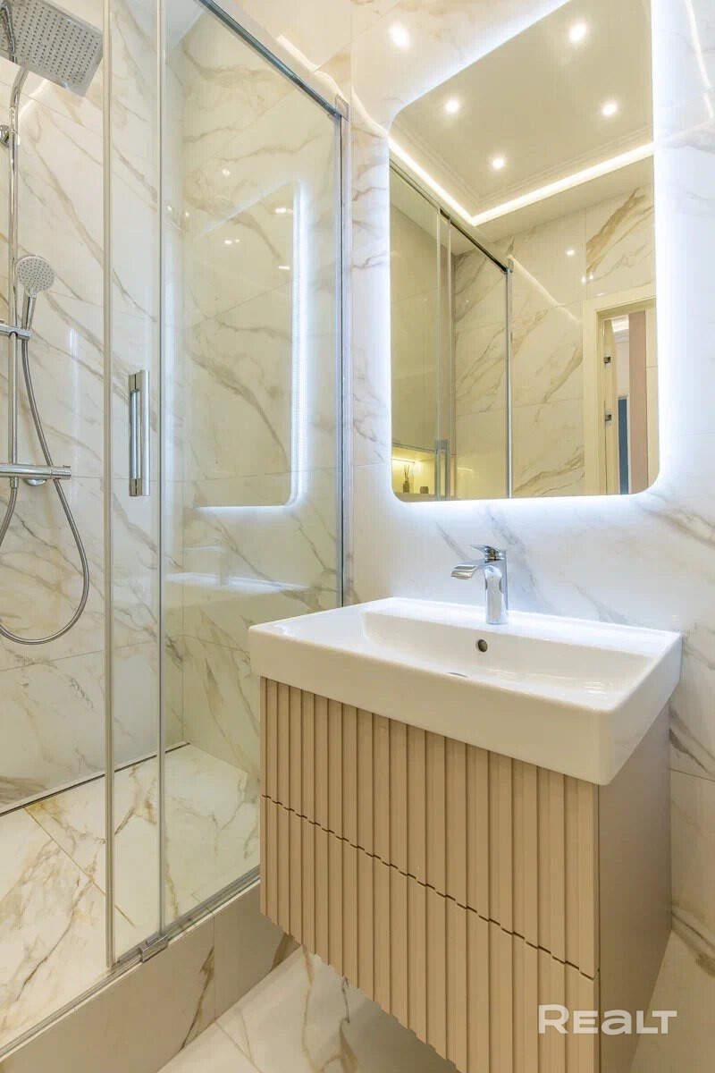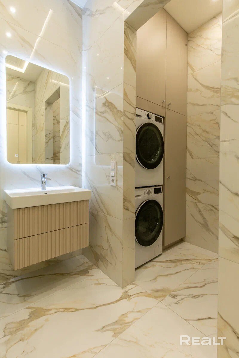 Сан.узел в итальянской плитке, вся сантехника Grohe, установлен бойлер Electrolux, душевая кабина, инсталляция, умывальник с тумбой, зеркало с подсветкой, стиральная и сушильная машины марки LG.