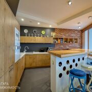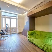 - немецкая кухня Porto-Porto со встроенная техникой: холодильник и морозильная камера Liebherr, посудомойка Вosh, варочная панель, духовой шкаф, микроволновая печь Gorenje, водоподготовка EcoWater, измельчитель пищевых отходов InSinkErator. Столешница белый камень, фурнитура Blum. Обеденная зона: дубовая столешница, барные стулья Angelo Cappellini. Диван Lign roset.