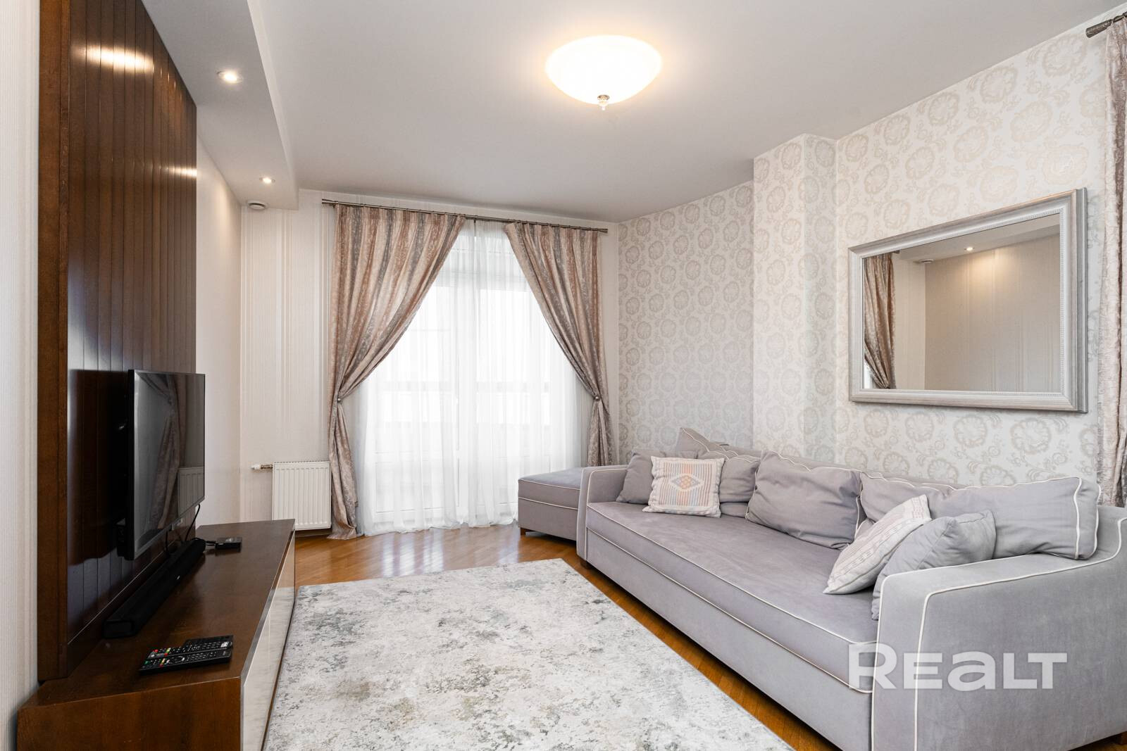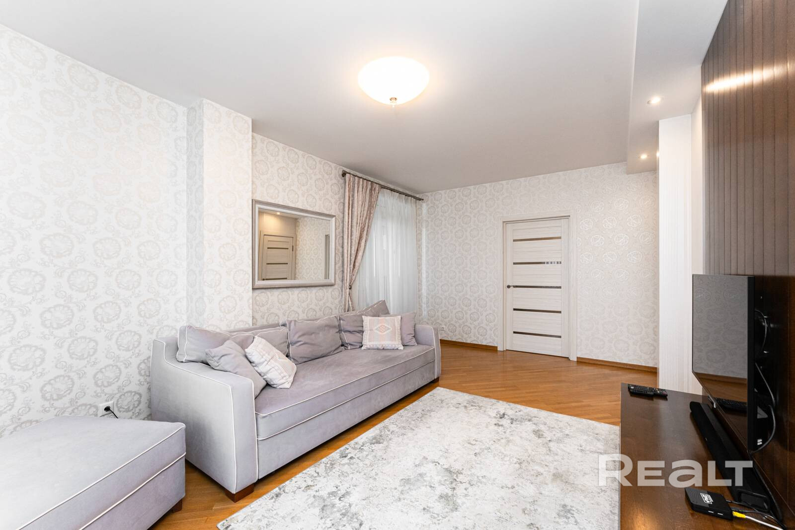 Квартира оборудована всей необходимой мебелью и техникой, все остается. Удобная планировка, два санузла (есть и ванна, и душевая кабинка), оборудованная гардеробная, две застекленные лоджии. Из лоджии шикарный вид на стелу "Минск-Город герой". Полы в квартире- паркет и плитка.