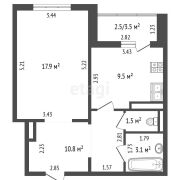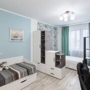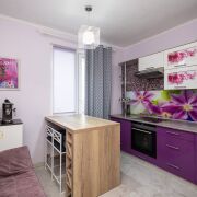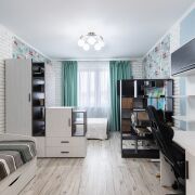 В квартире сделан качественный ремонт. Площадь по СНБ 45,3 кв. м. Просторная комната зонирована, что позволяет легко организовать пространство для отдыха и работы. На кухне барная стойка и большой диван. В прихожей встроенные вместительные шкафы. Застекленная светлая лоджия.