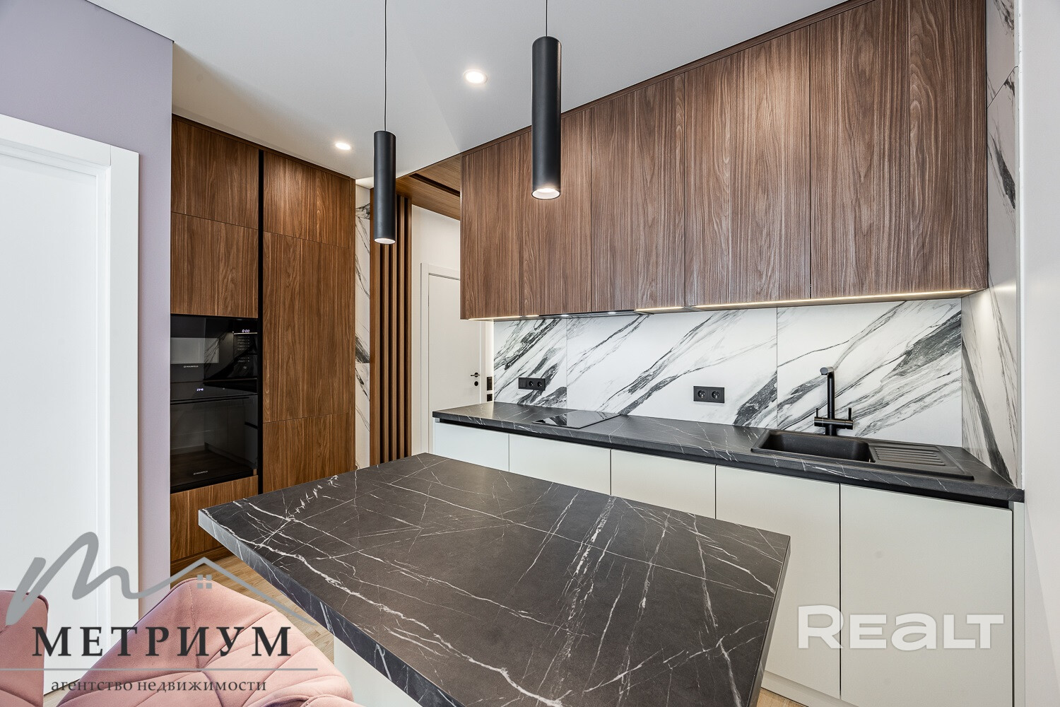 Функциональная кухня порадует новых хозяев различными сценариями освещения, а техника известных производителей будет служить долго и надёжно. Комфорт добавляют такие изобретения инженерной мысли как: индукционная варочная панель, посудомоечная машина, стирально-сушильная машина, встроенный холодильник, скрытая вытяжка, встроенная микроволновая печь и духовой шкаф.