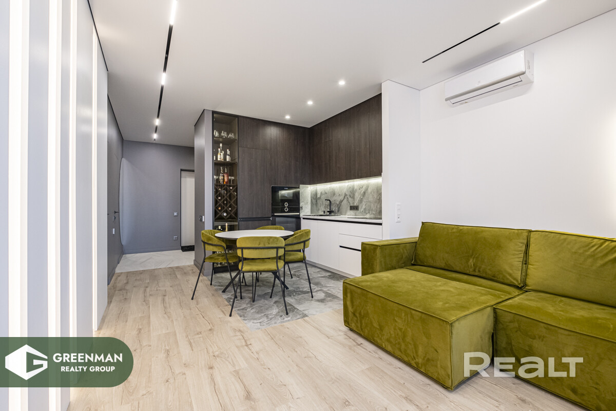 В квартире сделан качественный ремонт, большая кухня – гостиная, гардеробная, спальня, лоджия с панорамным остеклением и совмещенный санузел.