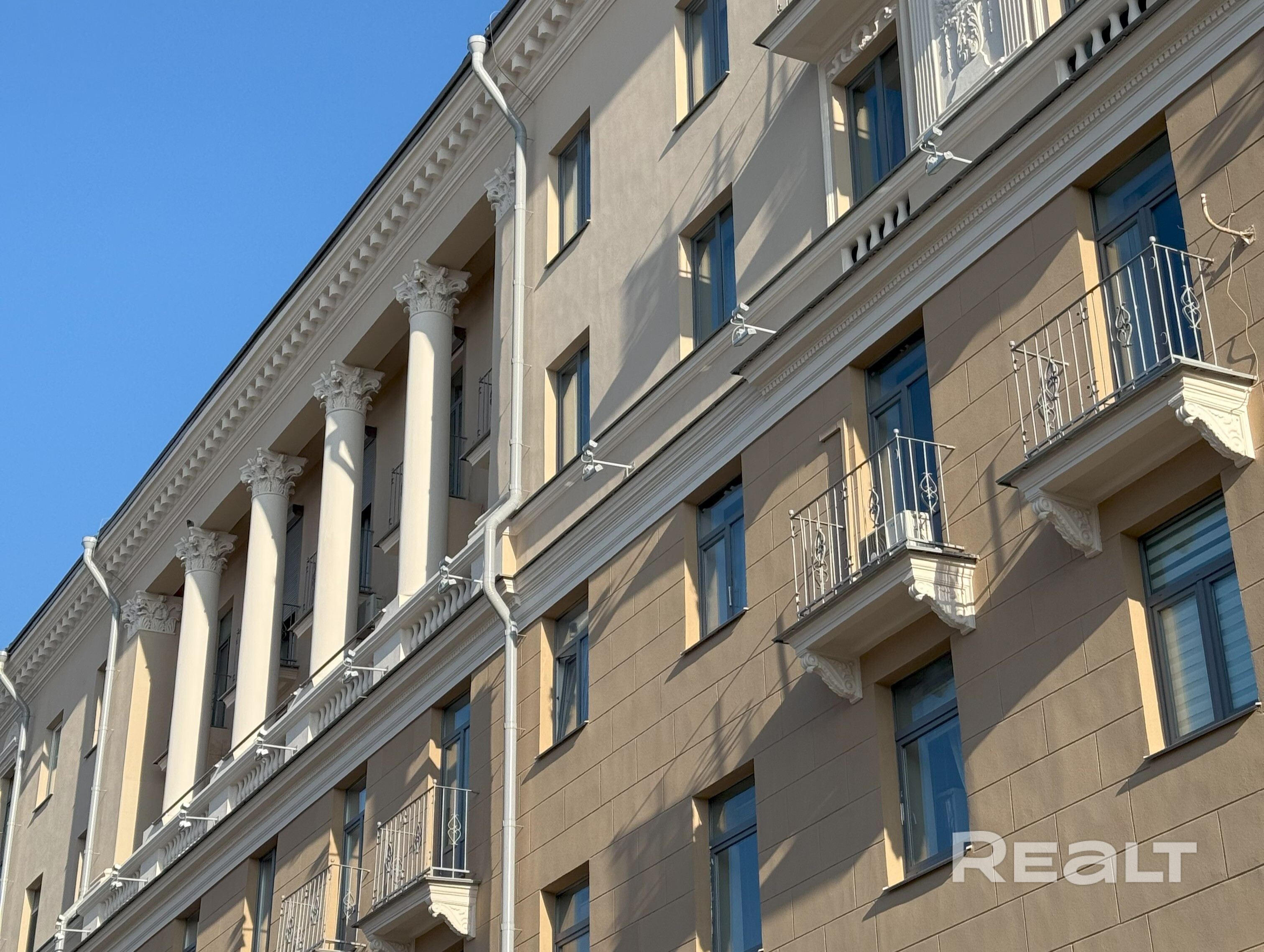Дом расположен в самом сердце города Минска на берегу реки Свислочь. Дом построен по индивидуальному проекту в стиле «Советского неоклассицизма», архитектором которого был Роман Гегарт. Фасад здания дома уникален – украшен богатейшей лепниной, вазами и лавровыми венками.