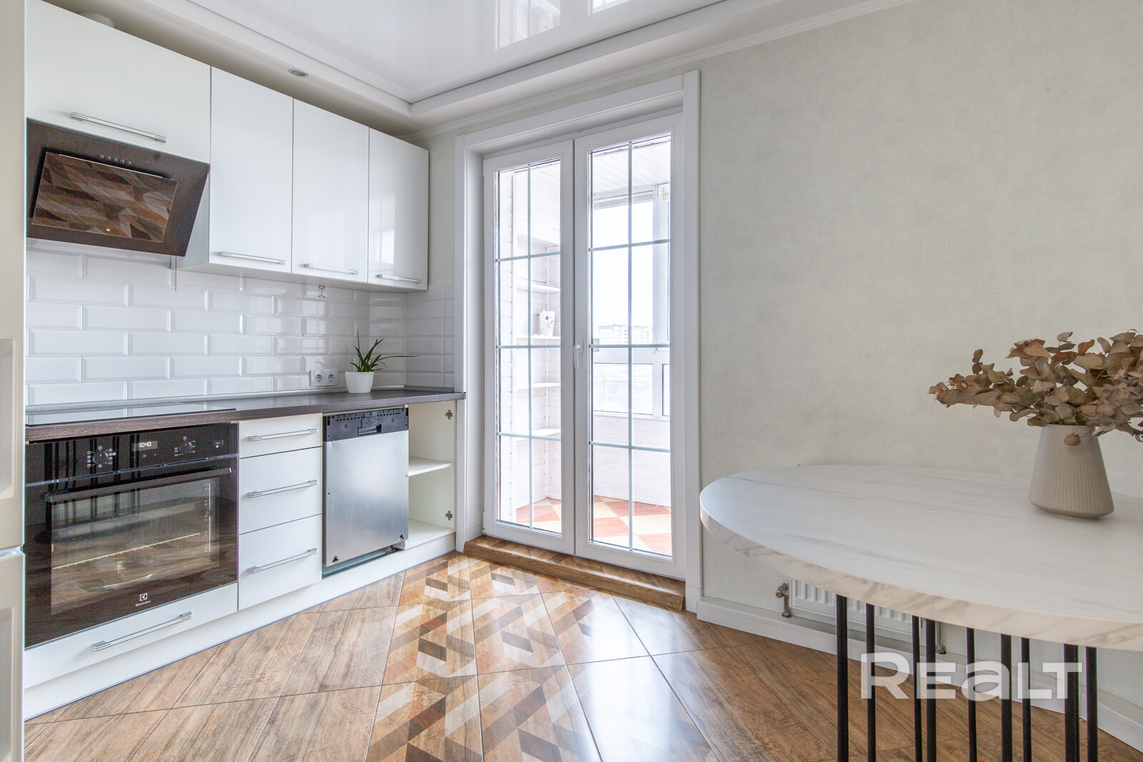 Кухня 9,1 м2 со встроенной кухней и бытовой техникой: посудомоечная машина Bosch, холодильник LG, духовой шкаф Electrolux и вытяжка . В зоне коридора и кухни пол облицован плиткой под дерево. За французскими окнами в пол выход на застекленную лоджию, также с видом на пруд!