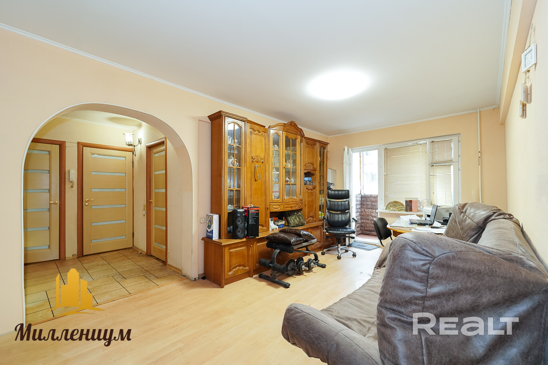 Есть места для парковка транспорта во дворе на 1-5 машин, рядом Malanka. Окна на проспект Машерова – тишина, свежий воздух и живописные виды.