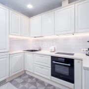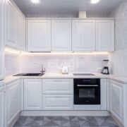 - Кухня с встроенной бытовой техникой: холодильник, варочная панель, духовой шкаф.