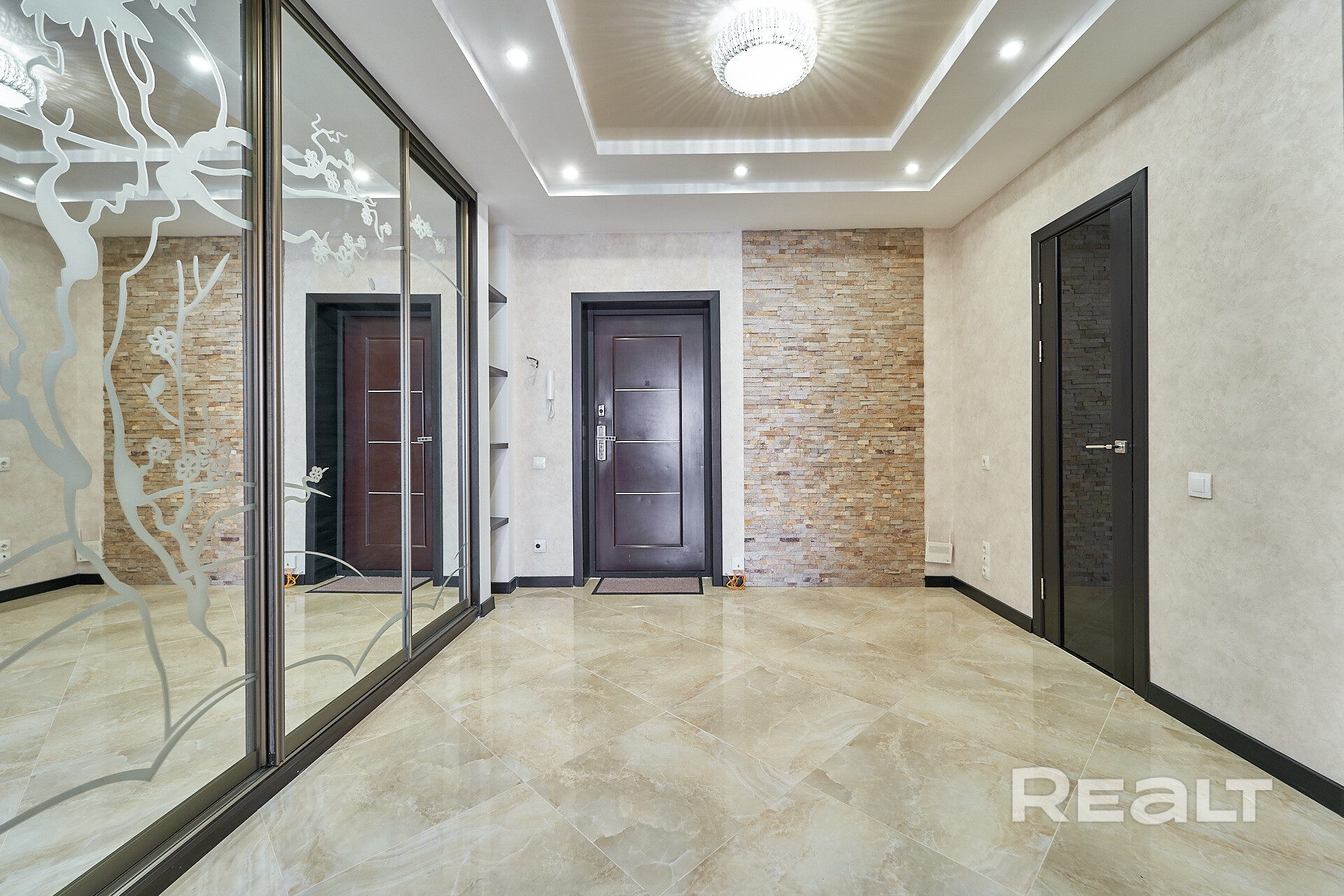 При обустройстве квартиры особое внимание уделялось качеству и комфорту. Отделка выполнена из материалов от мировых производителей. Напольное покрытие сочетает ламинат и плитку (в санузле, кухне и коридоре «тёплый пол»). В коридоре - шкаф-купе для хранения.