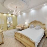 На полу дубовая паркетная доска, плитка - Испания, межкомнатные двери – массив, корпусная мебель – массив и натуральная кожа, обои Италия.