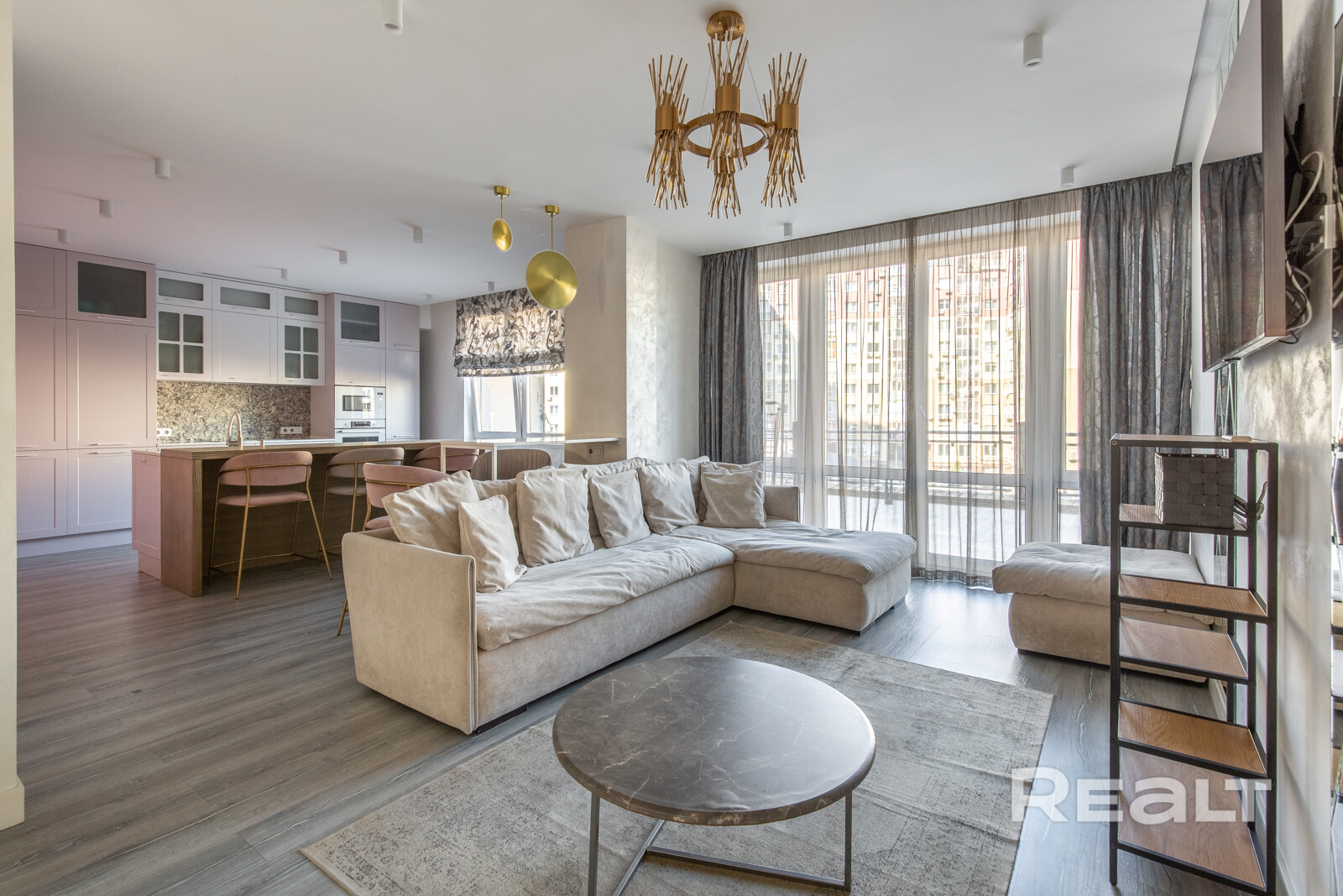 *Остров кухни и барная стойка выполнены из кварцевого камня Technistone (Чехия) Noble Areti Bianco